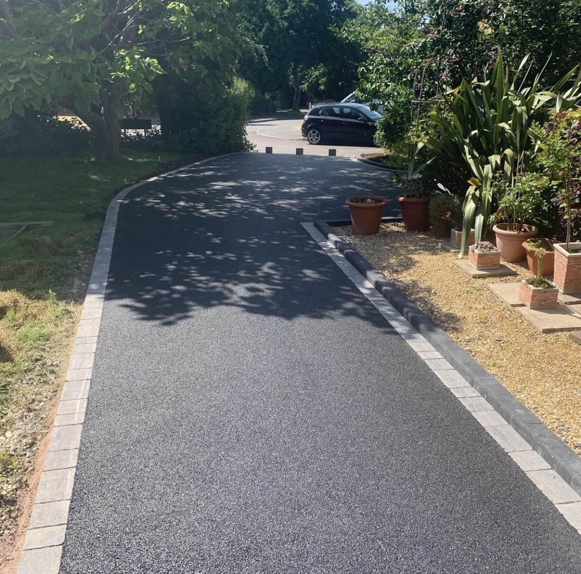 Pull up existing stone driveway which was messy, weedy and unattractive. Excavated 12 inches of dirt and soil, laid Terram and re stoned with type 2. Compacted, Curbs laid around the perimeter and then pavers laid including a small apron on the driveway entrance. Driveway was then ready for Tarmac which has completely transformed this property.