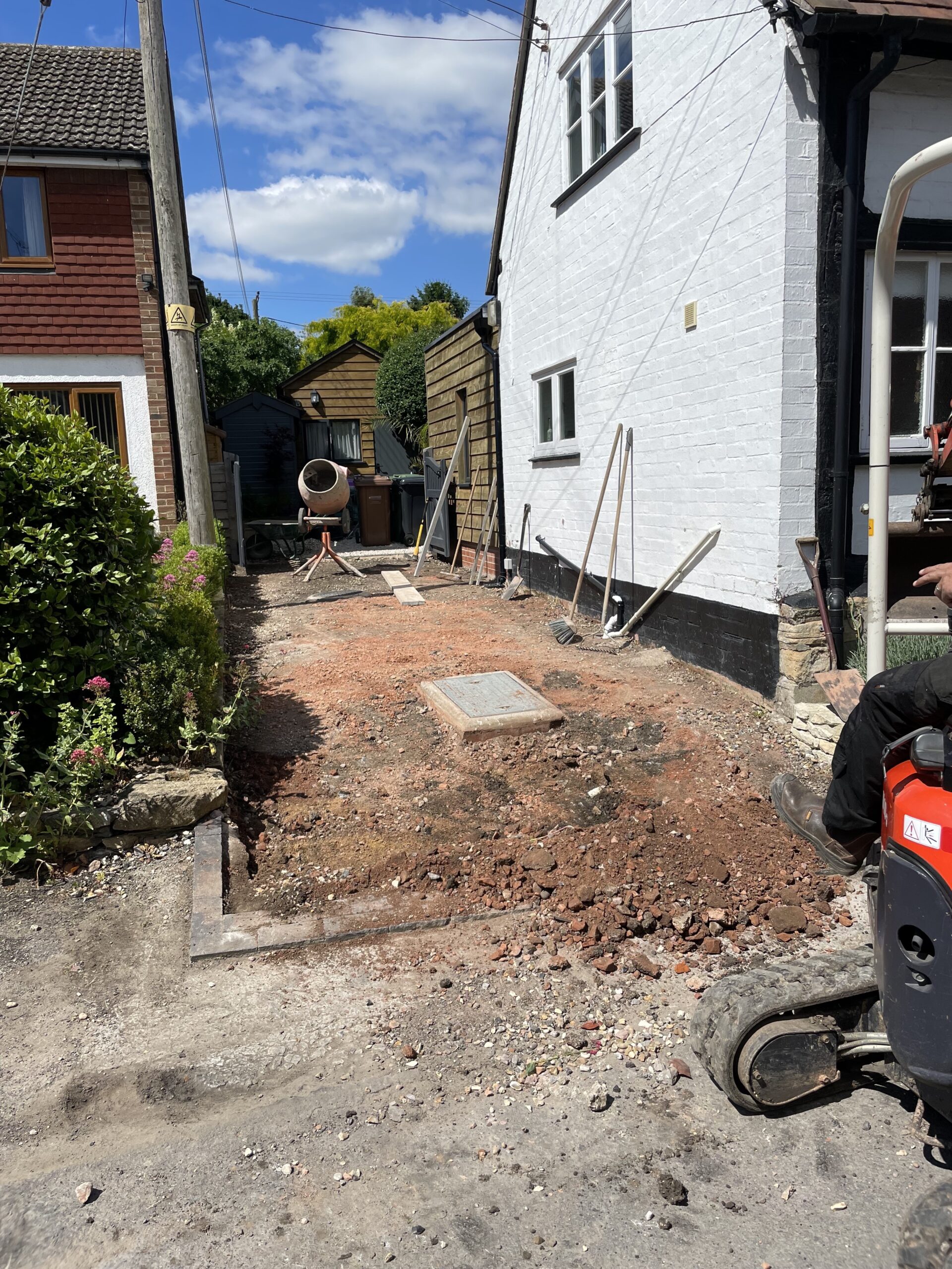 This project in Eckington was for returning elderly customers. We had previously built an extension on their property so when they started experiencing problems with their driveway they requested some alterations to be made. The problem was that the gradient of their driveway was too much for the gravel. They were constantly losing traction getting on the driveway and flicking gravel out into the road. We dug off the whole area, reduced the man hole level by 200mm and decreased the gradient of their driveway. We when laid a paved apron at the bottom of the driveway which gave them traction and helped retaining the new gravel.